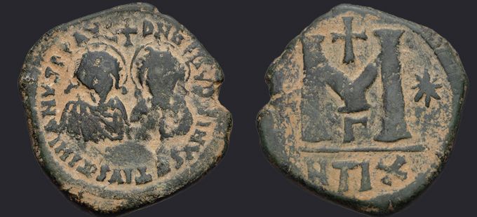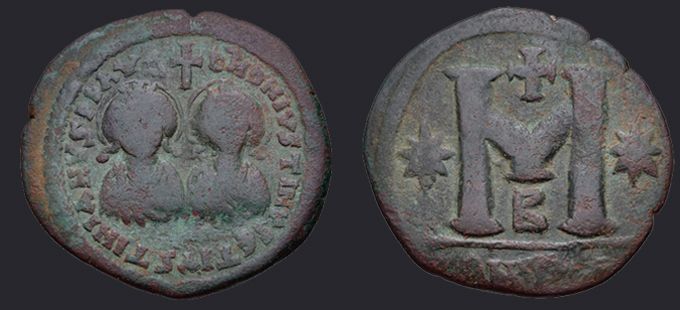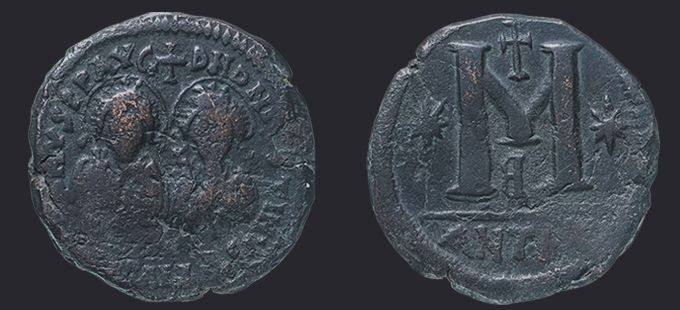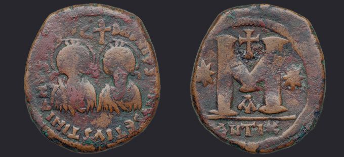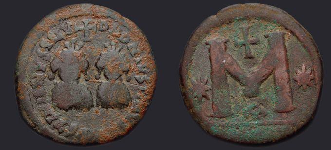 | Sear | 129 F ₤200, VF ₤400 | Аверс: DN DN IVSTINVS ЄT IVSTINIANVS PP AVG, погрудное изображение Юстина и Юстиниана в диадемах, доспехах и палудаментумах, анфас; между их голов крест. Реверс: знак номинала М между двух звезд; вверху крест; внизу оффицина; под обрезом ANTIX. На монетах этого типа встречается только оффицина А. |