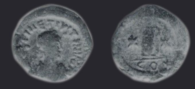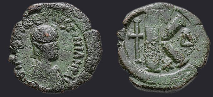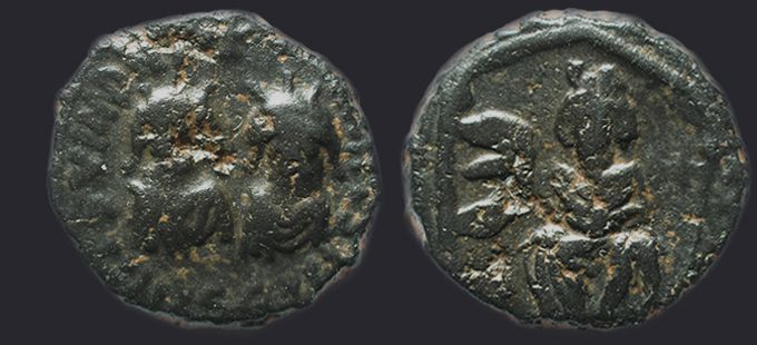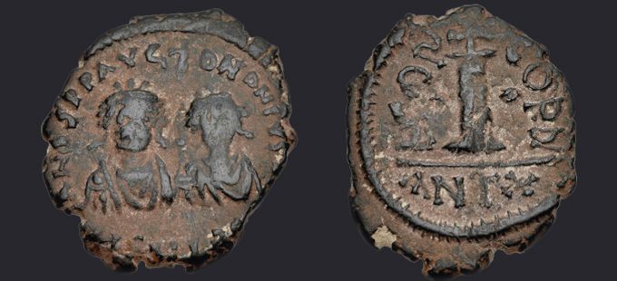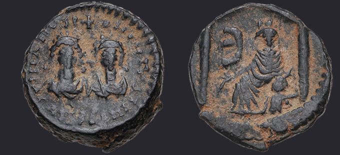 | Sear | 133 F ₤45, VF ₤95 | Аверс: + DN DN IVSTIN ЄT IVSTINIANVS PP A, подобен Sear #129, но без креста между голов императоров. Реверс: Тихе города Антиохия сидящая влево в храме; перед ней Э. |