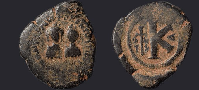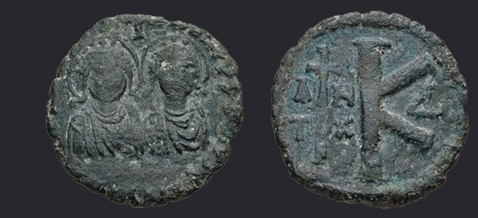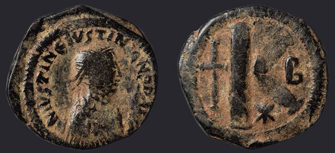 | Sear | 126A F ₤60, VF ₤130 вариант легенды DN IVSTIN Є IVSTINIAN P AV | Аверс: DN IVSTIN Є IVSTINIAN P AV или DN IVSTIN ЄT IVSTINIAN P AV, погрудное изображение Юстина в диадеме, доспехах и палудаментуме, вправо. Реверс: знак номинала K; слева длинный крест, вверху и внизу звезды, справа оффицина. На монетах этого типа встречаются оффицины A, B, Δ и Є. |