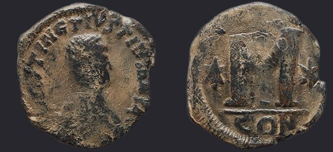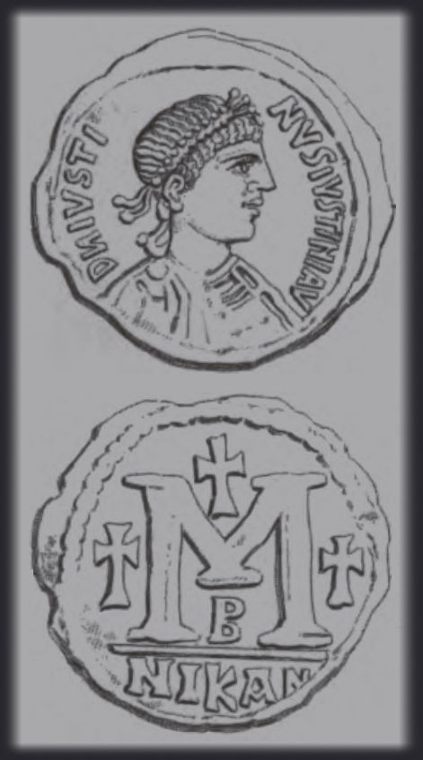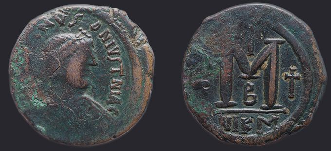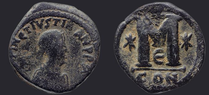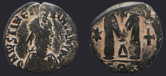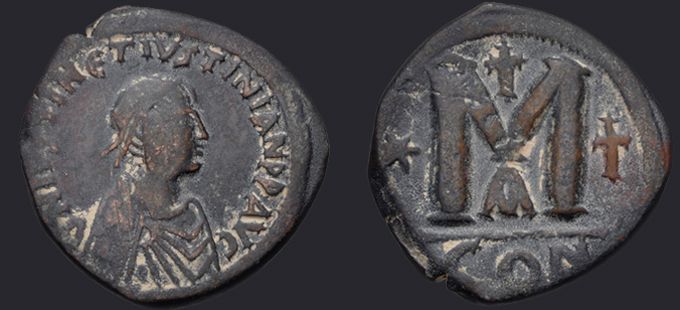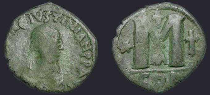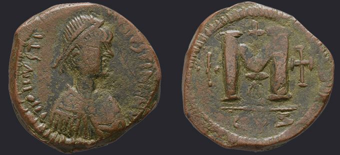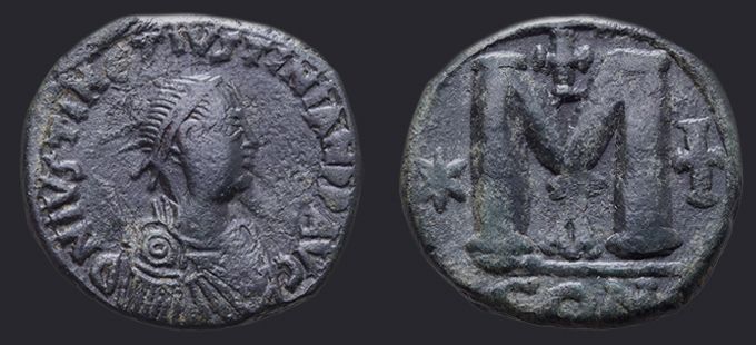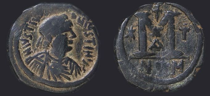 | Sear | 125 F ₤55, VF ₤120 | Аверс: DN IVSTIN Є IVSTINIAN PP AV, погрудное изображение Юстина в диадеме, доспехах и палудаментуме, вправо. Реверс: знак номинала М; слева звезда, справа крест; вверху крест; внизу оффицина; под обрезом CON. На монетах этого типа встречаются оффицины А, B, Г, Δ. [1] |