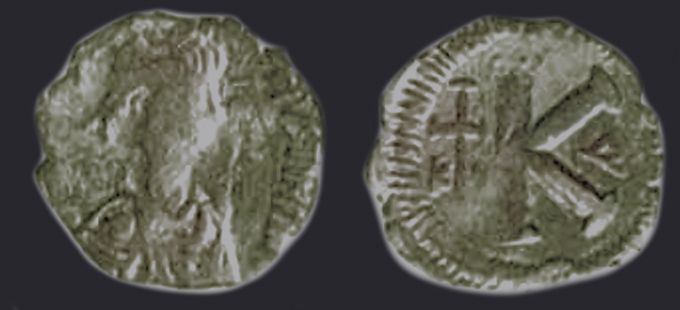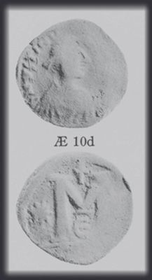 | Sear | 131 F ₤120, VF ₤250 | Аверс: подобен предыдущему типу. Реверс: знак номинала K; слева длинный крест между литтерами в его углах A │ N ; справа оффицина. —— T │ Х На монетах этого типа встречаются оффицины A и Δ. |