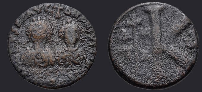 | Sear | 126 F ₤55, VF ₤120 | Аверс: подобен предыдущему типу, но легнда DN IVSTIN ЄT IVSTINIAN PP AVG. Реверс: подобен предыдущему типу. На монетах этого типа встречаются оффицины A и Δ. |