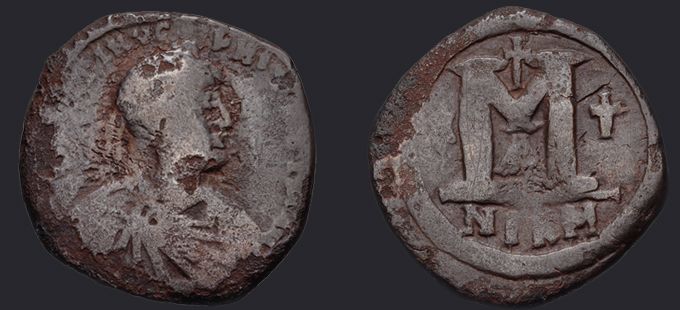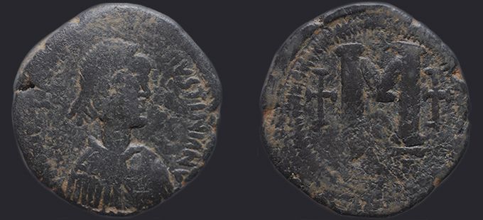 | Sear | 128A F ₤55, VF ₤120 | Аверс: DN IVSTINVS IVSTINIAN, погрудное изображение Юстина в диадеме, доспехах и палудаментуме, вправо, иногда на плече звезда. Реверс: знак номинала М между двух крестов; вверху крест; внизу оффицина; под обрезом KYZ. На монетах этого типа встречаются оффицины A и B. |