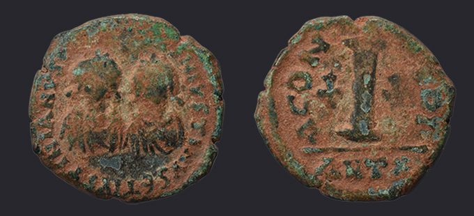 | Sear | 132 F ₤110, VF ₤225 | Аверс: DN DN IVSTINVS ЄT IVSTINIANVS PP AV, подобен предыдущему типу. Реверс: CONCORDI (в начале надписи оффицина) вокруг знака номинала I, увенчаной крестом; в поле слева и справа точки или кресты; под обрезом ANTIX. На монетах этого типа встречаются оффицины A и B. |