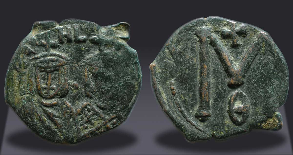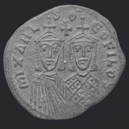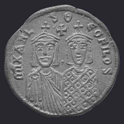 | Sear | 1642 F ₤30 VF ₤65 | Л.с. MIXAHL S ƟЄOFILOS, как предыдущая, но есть варианты с кружками в основании крестов на коронах (DOC 9, Class 3a; каталог #1642.1) и без таковых (DOC 10, Class 3b; каталог #1642.2), а также Феофил иногда изображен с бородой (DOC 11, Class 3c; каталог #1642.3); между бюстов точка. Об.с.как предыдущая, но внизу Ɵ. | |||