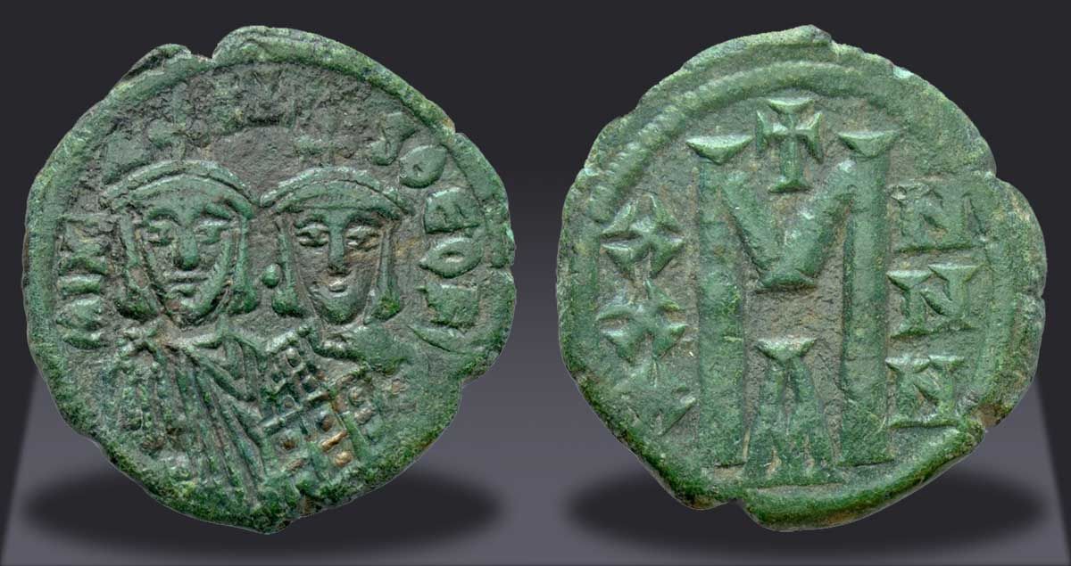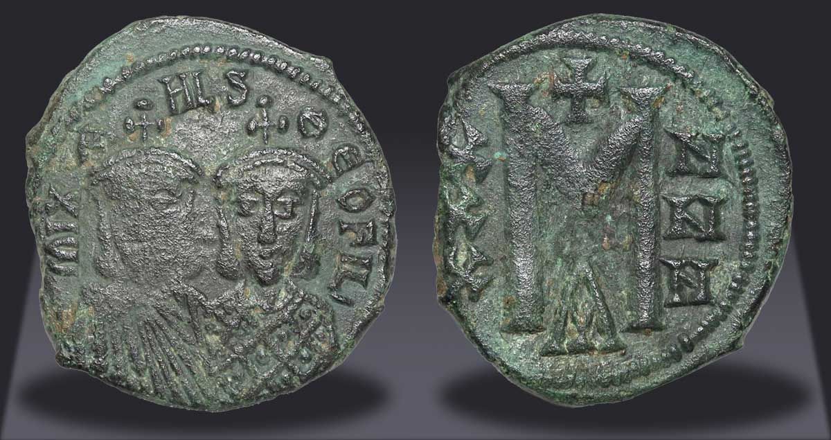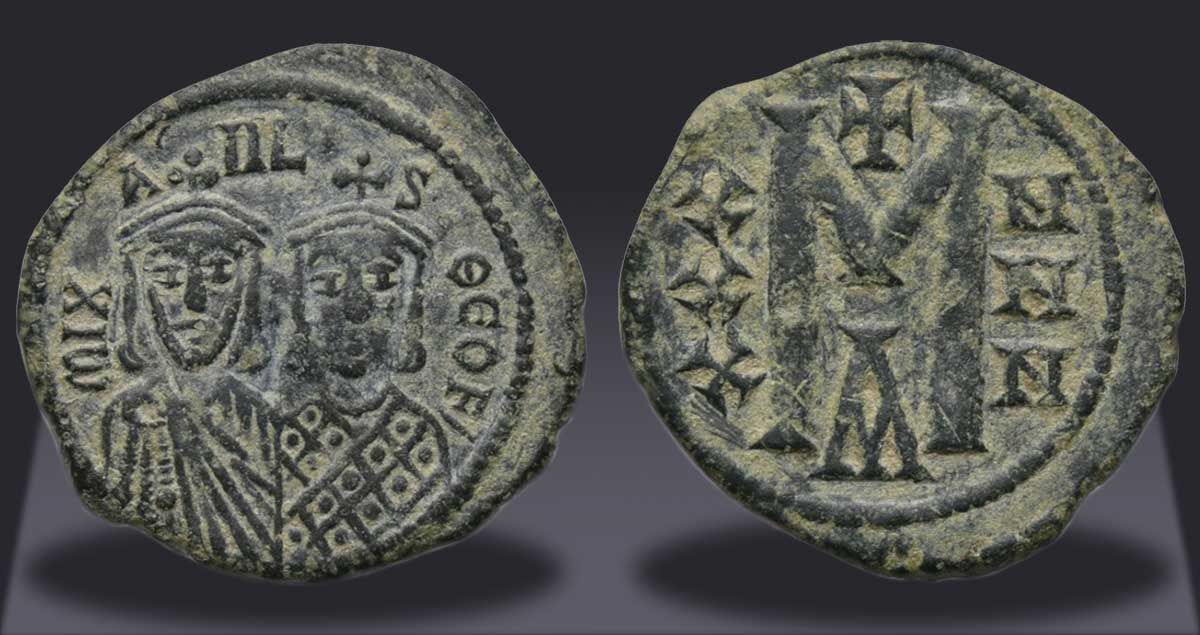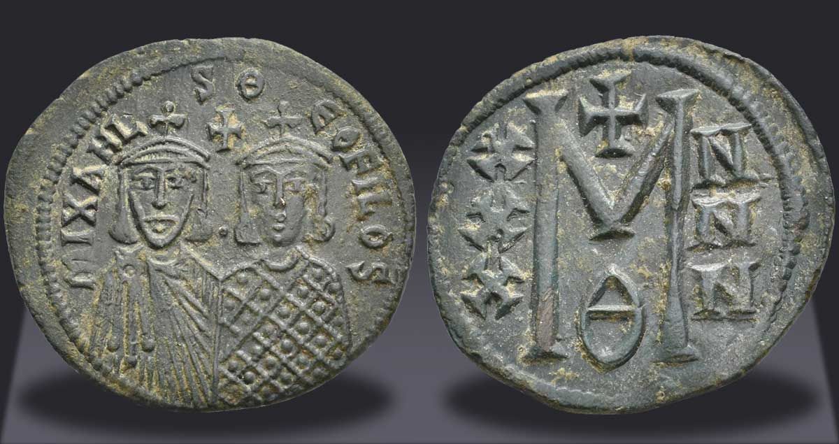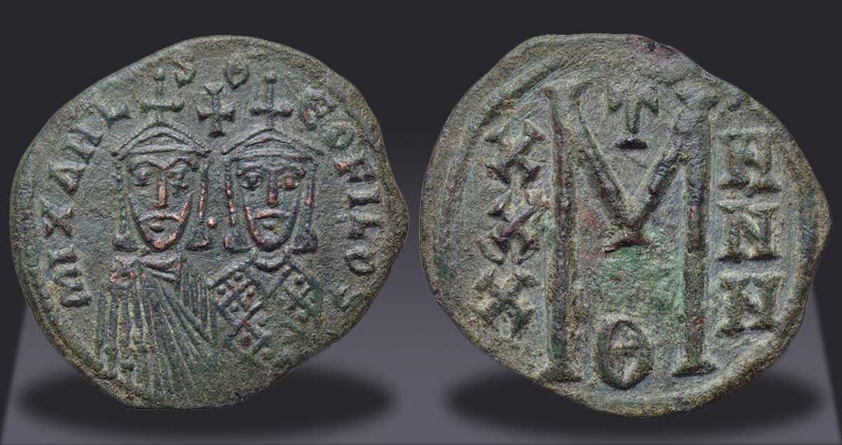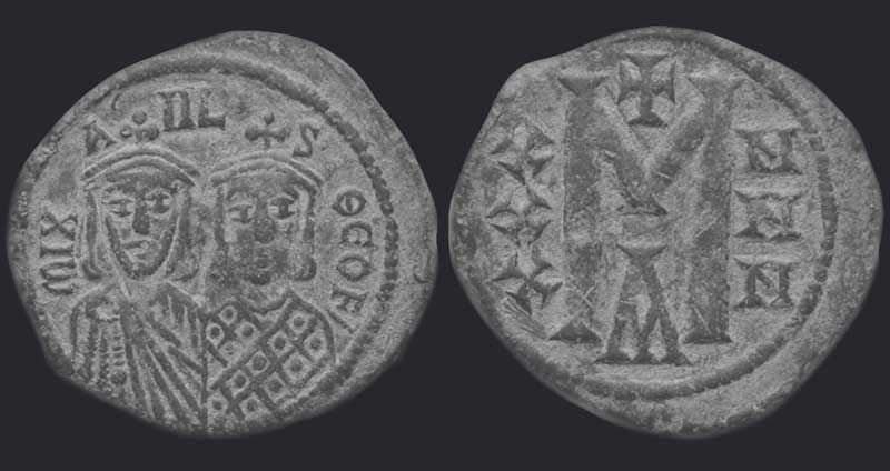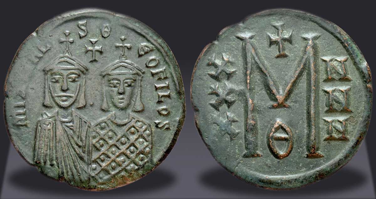 Нововведение в виде литеры Ɵ на обороте, объяснятся заменой потерявшей свое значение как оффицины литеры А на маленькую Ɵ – инициал младшего соправителя. При этом литера М к этому времени уже могла восприниматься не как знак номинала, а как инициал имени императора. Впервые подобное изменение значения литер на оборотной стороне, предположительно, было внесено на Сицилии при чеканке единственного типа провинциальных медных монет Михаила II. Оно могло быть вызвано тем фактом, что ранее на сиракузских монетах Льва V и Константина на оборотной стороне были изображены инициалы двух соправителей - ΛΚ. В правление Михаила II их заменили литерами М и Ɵ, расположенными одна над другой. Когда в Константинополе были введены крупномодульные пореформенные фоллисы, этот изначально провинциальный вариант был заимствован для новых монет (см. DOC, том III, часть 1, стр.389-390). | |||||
