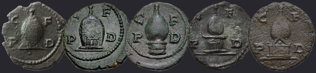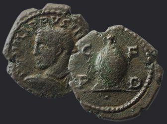 Город Деульт (совр. Дебелт в Болгарии), основанный императором Веспасианом, в свое время был одной из влиятельных римских колоний во Фракии. Colonia Flavia Pacensis Deultum – так гордо звучала его официальная и полная транскрипция, часто сокращаемая на памятниках эпиграфики и нумизматики до аббревиатуры C.F.P.D. Как и положено колонии, Деультом чеканилась своя монета с латинской легендой. Среди сюжетов реверса встречаются стандартные для колониальной чеканки типы: жрец, пашущий на волах, волчица с близнецами, Марсий и т.д. Но есть и ряд сюжетов, выделяющих чеканку Деульта среди других городов Фракии. Среди множества интересных типов привлекает внимание изображение загадочного объекта, до сих пор вызывающего дискуссии среди нумизматов. Он отчеканен на мелких, не превышающих 19 мм в диаметре, номиналах. Появление его отмечено в чеканке Максимина I Фракийца, Гордиана III, Филиппа I Араба. Объект представляет собой вертикальный эллипсоид с коническим завершением, напоминающий луковицу. Как правило, он имеет некий базис, а в редкой вариации этот базис превращается в маленький храм с колоннадой. | ||||||