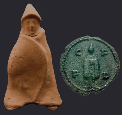 Фигурка Телесфора, одетого в плащь с капюшоном (II-I в.в. до н.э.) и монета Деульта с его изображением времен Филиппа I | ||||||